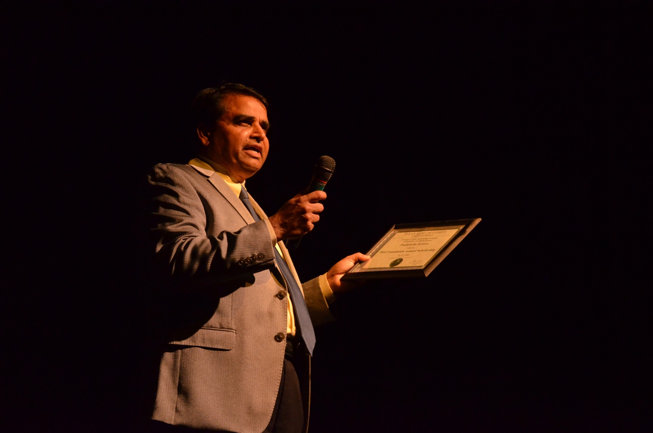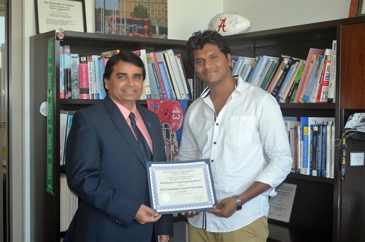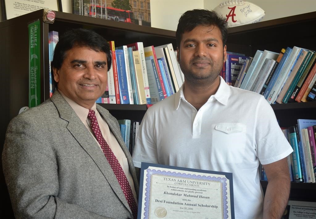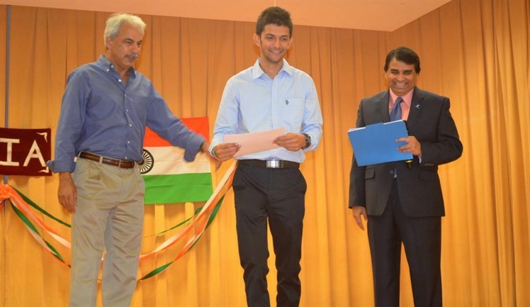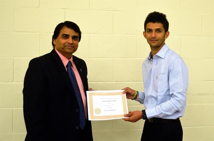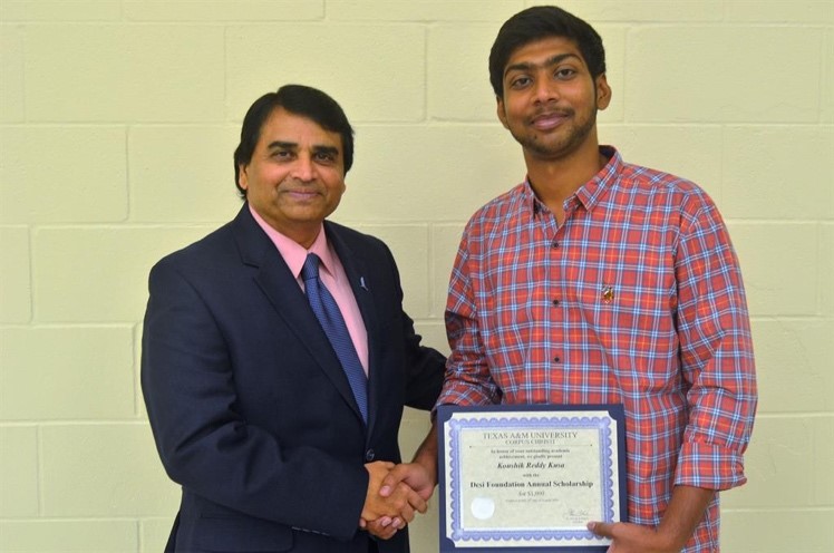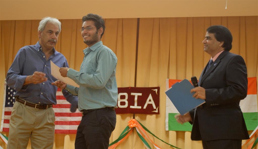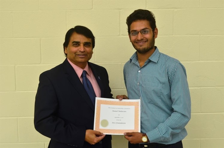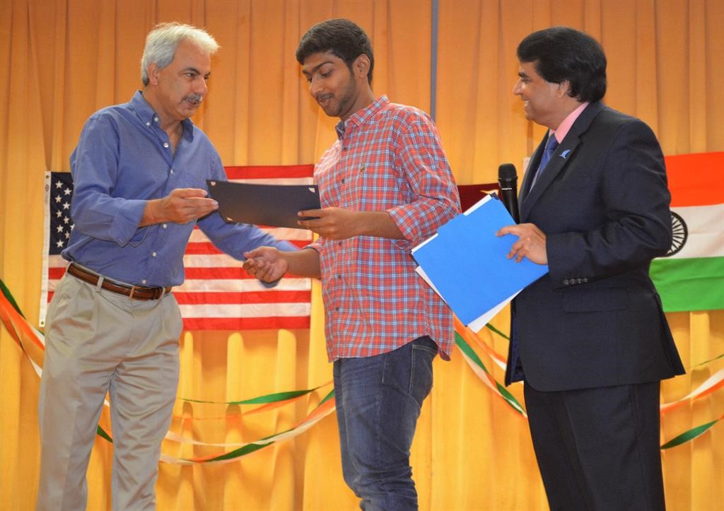Koushik receiving his scholarship certificate from Rajan Ahuja, the CEO of SV Energy Company